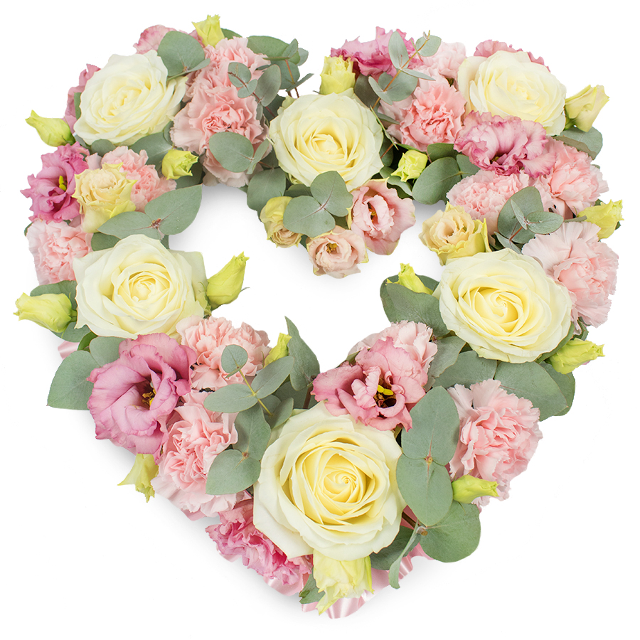 Celebrate your sentiments with our Refined Open Heart bouquet. This beautiful arrangement features a delicate mix of white roses, pink carnations, pink lisianthus, and eucalyptus leaves, thoughtfully arranged to convey your heartfelt message.
